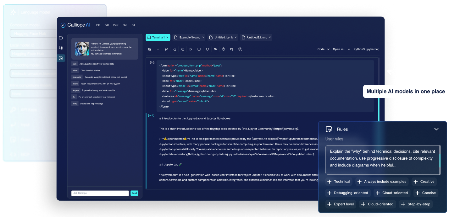 Calliope unifies notebooks, agents, pipelines, and AI models into one secure, browser-based platform — so teams can move from prototype to production with zero setup and zero infrastructure overhead.
